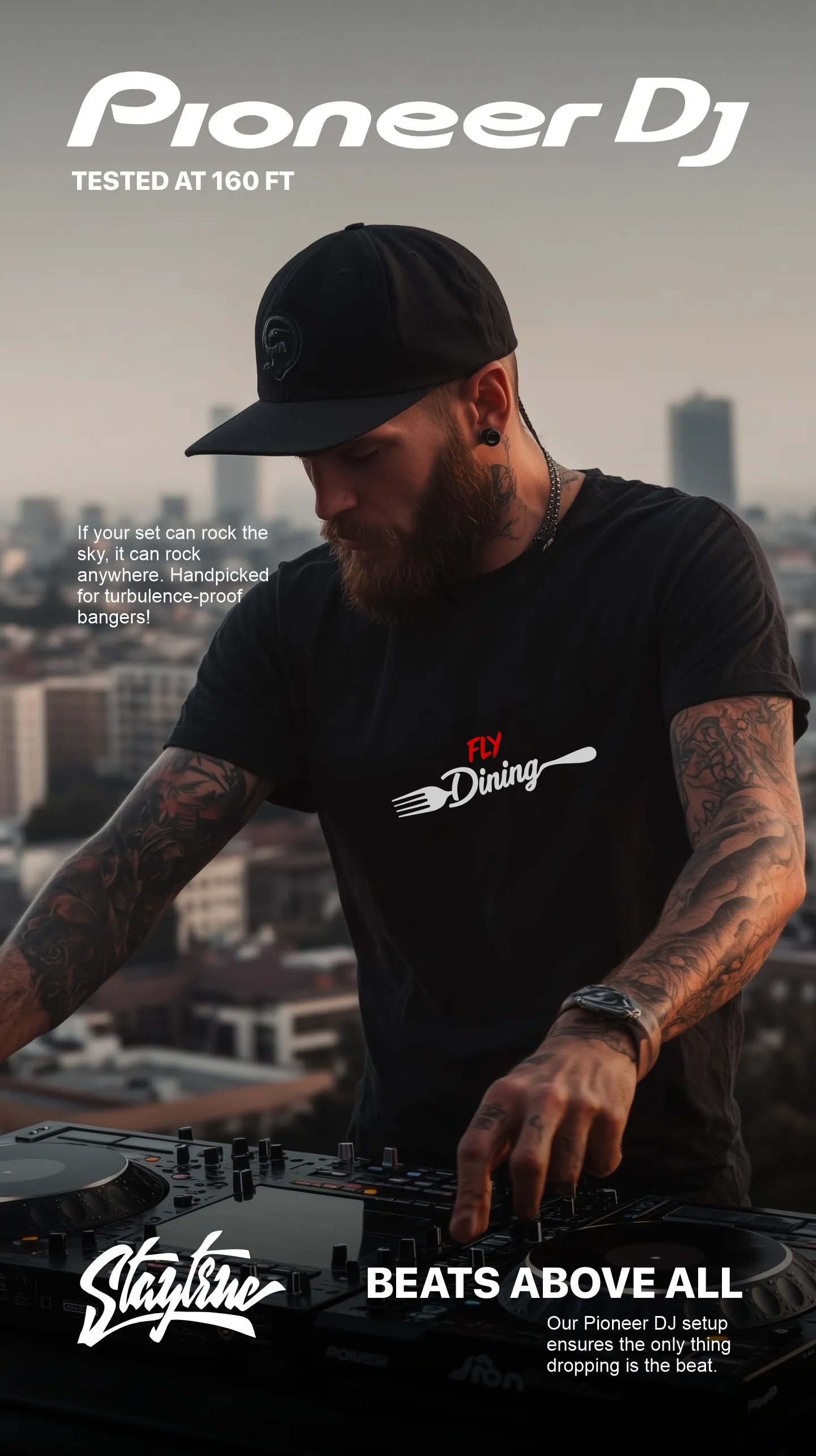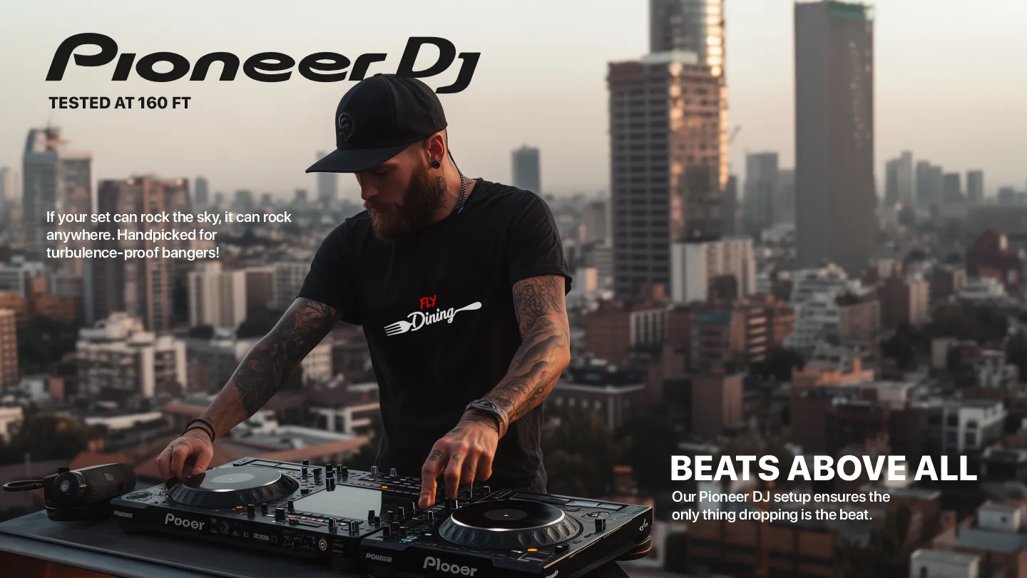 FlyDining’s precision engineered speaker system delivers perfectly balanced sound at 160 feet, ensuring deep bass, crisp treble, and immersive clarity no matter where you sit. Designed by top audio engineers, our strategic speaker placement guarantees that every guest enjoys studio-quality sound without distortion. Whether it’s a curated playlist or a live DJ set, the perfect volume and premium acoustics make every dining moment feel like a sky-high concert experience.