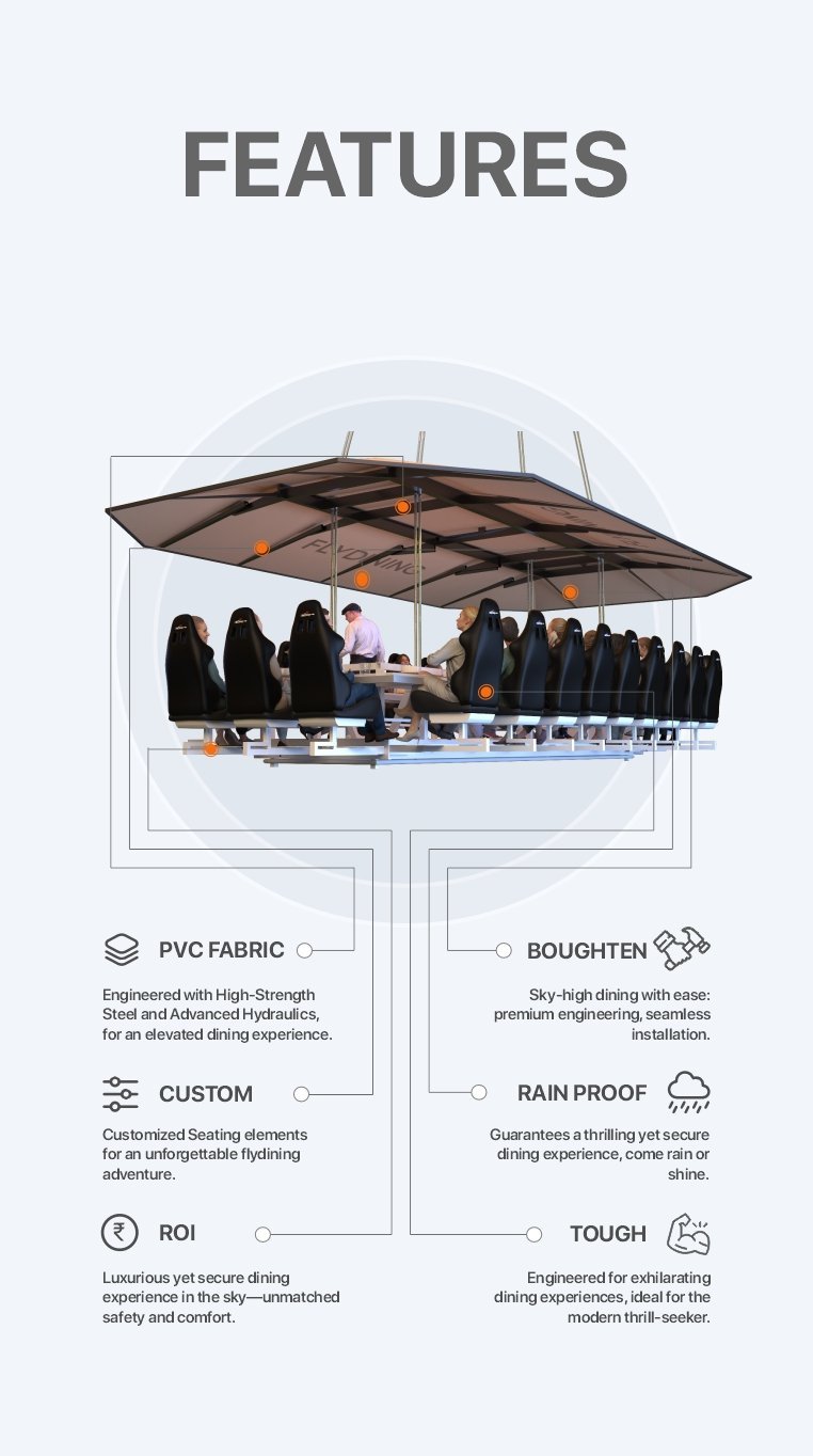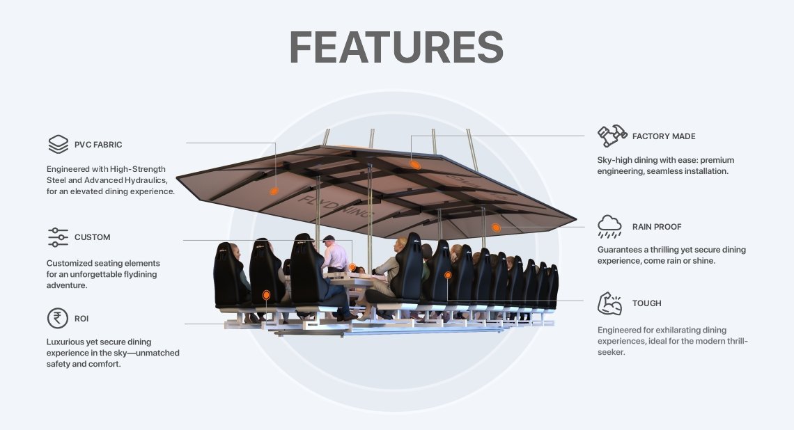 Experience Culinary Elevation with Flydining’s Dragon 24—A Sky-High Dining Marvel for the Adventurous and Discerning. Meticulously crafted with state-of-the-art technology and the finest materials, this airborne dining experience redefines luxury and excitement. Designed to meet international safety standards, Dragon 24 prioritizes your well-being while suspending you above breathtaking vistas. Rain or shine, our cutting-edge engineering ensures a smooth and secure dining experience. Whether you’re soaring above a bustling city or tranquil waters, Dragon 24 enhances your view with a unique blend of thrill and sophistication. Indulge in the ultimate dining escapade with Dragon 24, where exhilaration meets elegance.